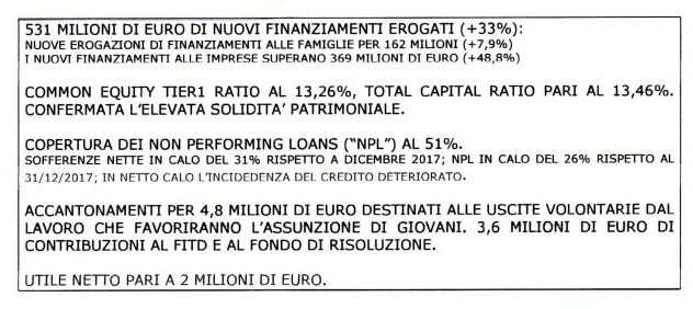 i crediti verso la clientela, in crescita del 3,2%, si attestano a 2.672 milioni di euro. Il nuovo credito erogato nel 2018 pari a 531 milioni (+ 33%) è stato concesso a privati e famiglie per 162 milioni (+7,9%) e ale imprese per 369 milioni (+ 48,8%);
