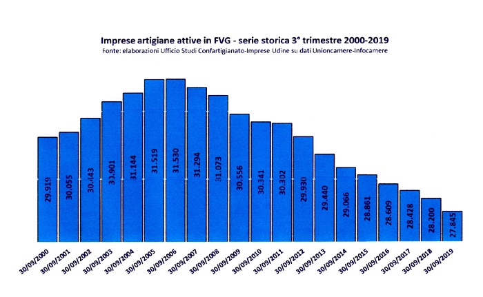 Allarme artigianato in Friuli Venezia Giulia. Le lancette dell’importante settore economico-produttivo sono infatti tornate indietro di quasi 50 anni. E’ dal 1971 che in regione non si rilevava uno stock d’imprese così basso: meno di 28 mila unità. La discesa, iniziata nel 2006, sembra non volersi arrestare. Dopo aver infranto la quota psicologica delle 30mila unità nel 2012, la caduta è proseguita nel 2014 trascinando il numero d’imprese sotto quota 29mila e ancora nel 2019, quando a gennaio le aziende artigiane sono scese sotto le 28mila unità. A settembre di quest’anno erano 27.845, poco meno della metà in forze nell’ex provincia di Udine (13.773), il resto tra quelle di Pordenone (7.276), Trieste (4.395) e Gorizia (2.401).