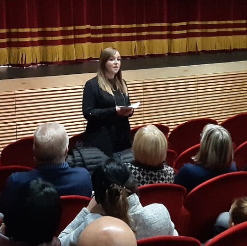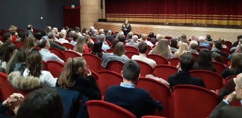 In copertina e qui sopra due immagini dell’affollato Teatro Pasolini mentre parla l’assessore Ilaria Peloi.