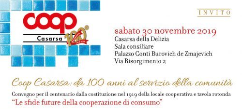 Un grande evento, con illustri ospiti regionali e nazionali, conclude le celebrazioni pubbliche per i cento anni di vita della Cooperativa di Consumo di Casarsa, realtà tra le più importanti del panorama della cooperazione del Friuli Venezia Giulia. Oggi si terrà, infatti, nella sala consiliare del Palazzo Conti Burovich de Zmajevich, una mattinata di riflessione su passato, presente e futuro della cooperazione di consumo, alla quale parteciperanno tra gli altri Mauro Lusetti, presidente Legacoop nazionale, Maurizio Gardini, presidente Confcooperative nazionale, e Marco Pedroni presidente Coop Italia, mentre le conclusioni saranno affidate a Massimiliano Fedriga, presidente della Regione Autonoma Friuli Venezia Giulia. Inizio alle 9.30 con ingresso libero fino esaurimento posti, mentre al termine ci sarà il brindisi del centenario offerto dalla cooperativa. Il tutto in collaborazione con la Città di Casarsa della Delizia, Confcooperative Pordenone, LegacoopFvg e Coop Italia.
