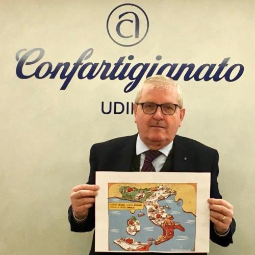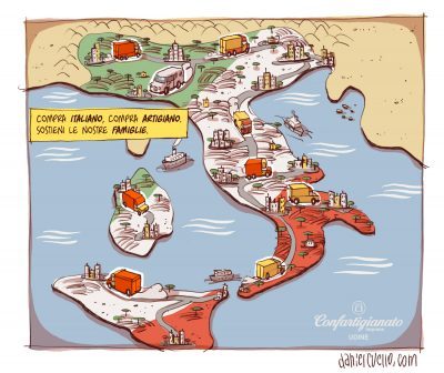 Da qui, dunque, un pressante appello, proprio in questi giorni pasquali: “Compra italiano, compra artigiano. Sostieni le nostre famiglie”. E’ questo, infatti, lo slogan che affianca l’illustrazione commissionata da Confartigianato-Imprese Udine a Daniel Cuello per invitare i consumatori ad acquistare prodotti locali in questo difficile momento di emergenza sanitaria ed economica. Un messaggio conciso come del resto l’immagine che accompagna: la penisola italiana, vestita del Tricolore e percorsa da mezzi su gomma, ferro e mare che instancabili la attraversano da Nord a Sud per consegnare merci.