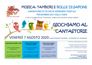 “Musicandola – progetto socio-educativo musicale integrato”, come detto, riparte oggi un nuovo laboratorio chiamato “Musica, tamburi e bolle di sapone” di tecniche espressive musicali per bambini dai 5 agli 11 anni. Il titolo di questo incontro è “Musica, tamburelli e bolle di sapone – Giochiamo al cantastorie” alla Scuola di musica “Farandola”, in via Molinari 41, a Pordenone, in tre orari distinti: dalle 9 alle 10 per i bambini di cinque anni, dalle 10.30 alle 11.30 e dalle 12 alle 13 per i bambini dai 6 agli 11 anni. Per informazioni e prenotazioni: scrivi@farandola.it, tel. 9434 363339 oppure cell. 340 0062930. Prossimamente sono in fase di definizione altri appuntamenti.
