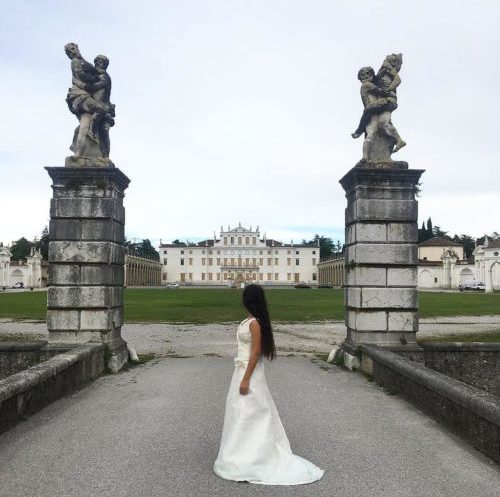 In copertina con gli abiti da sposa “solidali” davanti alla splendida Villa Manin di Passariano e qui sopra al Castello di Caneva.