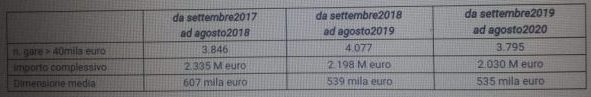 Nei dodici mesi, da settembre 2019 ad agosto 2020, sono state effettuate 3.795 gare di importo pari o superiore ai 40 mila euro, per un importo complessivo di poco superiore ai 2 miliardi di euro. Dati in calo rispetto ai dodici mesi precedenti (settembre 2018-agosto 2019) quando le gare erano state 4.077 (-7 per cento) e l’importo 2.198 milioni di euro (-7,7 per cento) ed ancora meno del 2017-2018 quando l’importo aveva superato i 2,3 miliardi di euro. Più di metà delle gare riguarda la fornitura di servizi: in attesa dei dati 2020, nel 2019 le gare per servizi sono state 1.594, per 1,2 miliardi di euro e un importo medio di 780 mila euro.