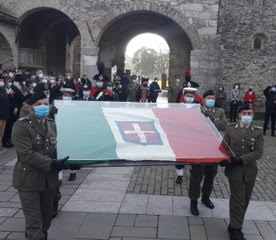 Ha preso poi la parola il presidente della Regione Fvg, Massimiliano Fedriga, che ha sottolineato il parallelismo fra due epoche: «Cento anni fa si è visto lo spirito di unità del Paese e la riconoscenza verso le persone che si erano sacrificate. Oggi non volgiamo lo sguardo solo per ricordare e onorare la memoria, ma dobbiamo recuperare da quel passato il significato di essere uniti. Una unità necessaria per affrontare le sfide che stiamo vivendo». E’ stato quindi il ministro della Difesa, Lorenzo Guerini, a chiudere i discorsi ufficiali, rivolgendo un saluto e ringraziando, oltre alle varie autorità, i sindaci presenti: «So quanto importante è il vostro lavoro quotidiano». Si è rivolto poi alle scolaresche, numerose nella antica piazza Capitolo: «Siete il futuro del Paese. Queste celebrazioni sono per voi. Il viaggio del Milite Ignoto è stato un momento fondamentale della storia italiana, un viaggio di unificazione del Paese, dopo la tragedia della Prima Guerra Mondiale. Quel viaggio ha formato l’identità del Paese, un viaggio che fu compiuto fra due ali di folla, con una partecipazione popolare rilevantissima e lanci di fiori ad ogni passaggio». Il governatore Fvg ha infine concluso: «Il mio è un invito al silenzio, senza retorica, per una celebrazione che unisca ancora una volta l’Italia e possa dargli forza per il futuro».