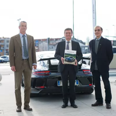 In copertina, il direttore generale di Civibank, Mario Crosta, con il volume CoBaPo dedicato alla Porsche.