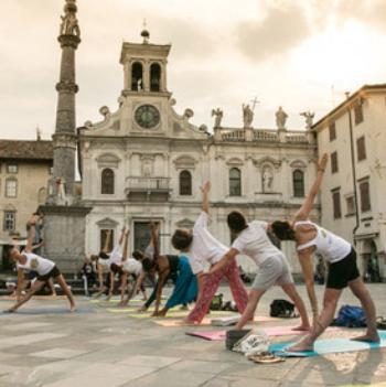 In copertina, esercizi di yoga in piazza Matteotti (San Giacomo) nel cuore di Udine.
