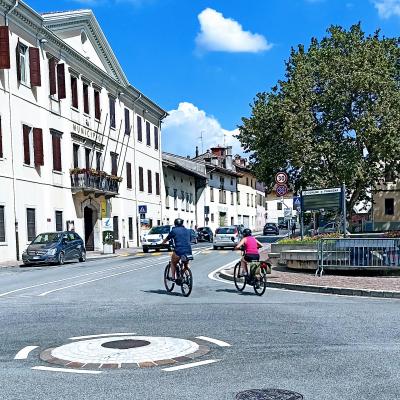In copertina, utenti della strada in bicicletta in piazza Unità, il centro di Fagagna.