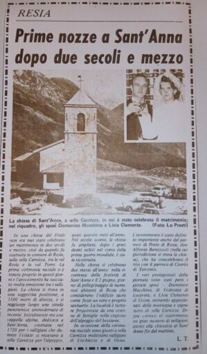 In copertina, i coniugi Muchino, Livia e Domenico,  e qui sopra l’articolo che cinquant’anni fa ricordava il loro matrimonio a Sella Carnizza nella chiesetta di Sant’Anna.