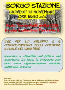 Borgo Stazione, a Udine, è un quartiere che soprattutto negli anni a noi più vicini ha subito un radicale cambiamento, soprattutto in seguito all’inserimento di tanti immigrati. Ecco, allora, l’opportunità di una riflessione che sarà proposta proprio oggi, 10 novembre, dal titolo “Idee per lo sviluppo e il consolidamento della coesione sociale del quartiere”. L’appuntamento è fissato alle 18.30, nella sala Tarantelli della Cisl in via Caterina Percoto, 5. Ci sarà un dibattito appunto sul futuro del rione udinese con la presentazione di idee e proposte “per una vera rigenerazione sociale, culturale, urbana”. All’iniziativa, con i numerosi organizzatori, collabora il Club per l’Unesco di Udine.