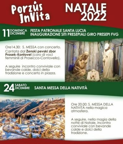 PORZÛS – Con la Pro Loco Amici di Porzûs e il Comune di Attimis torna “Porzûs invita”, calendario di eventi natalizi. Domenica 11 dicembre alle 14.30 Messa per la festa patronale di Santa Lucia con il coro di voci femminili Prosek-Kontovel. Inaugurazione dei siti presepiali e momento conviviale con dolci e bevande calde. Sabato 24 dicembre Messa della Natività alle 20.
