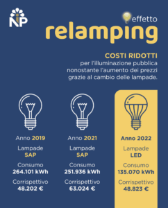 «Dati alla mano – spiega il presidente del Nip, Renato Piazza -, grazie alla sostituzione di 603 lampade tradizionali con le più efficienti lampade a led, abbiamo ridotto i consumi del 50%. Infatti, se nel 2019, prima del progetto ReLamping, avevamo un consumo di 264 mila kilowattora l’anno, ora nel 2022 appena concluso ne abbiamo consumati 135 mila. Il tutto senza rinunciare alla sicurezza notturna, visto che le nuove lampade garantiscono la stessa illuminazione se non addirittura migliore».