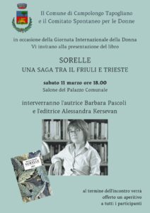 CAMPOLONGO TAPOGLIANO – Il Comune di Campolongo Tapogliano e il Comitato spontaneo per le Donne, in occasione della Giornata internazionale della Donna, hanno organizzato per oggi, sabato, la presentazione del libro “Sorelle. Una saga tra il Friuli e Trieste” di Barbara Pascoli. Con l’autrice interverrà l’editrice Alessandra Kersevan. Al termine dell’incontro, che si terrà alle 18 nel salone del palazzo comunale, verrà offerto un aperitivo a tutti i partecipanti.