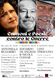 L’evento successivo, “Il dolore del mondo” (Le canzoni di Edoardo De Angelis incontrano la poesia di Giuseppe Ungaretti) avrà luogo il 3 agosto, alle ore 20.45, nella Corte Morpurgo di Via Savorgnana. Lo spettacolo raccoglie canzoni di De Angelis sul tema della guerra e della violenza, e letture di Giuseppe Ungaretti da “Il porto sepolto”, interpretate e commentate da Nicola Cossar. “Il porto sepolto” è la prima raccolta di poesie di Ungaretti, pubblicata nel 1916 a Udine presso lo Stabilimento Tipografico Friulano, nel periodo in cui il poeta stesso combatteva sul fronte del Carso quella che verrà poi definitiva la “Grande Guerra”. In questo contesto sapranno illuminare il pubblico la semplicità e la potenza rigenerante della parola di Ungaretti, poeta soldato e uomo di pace.