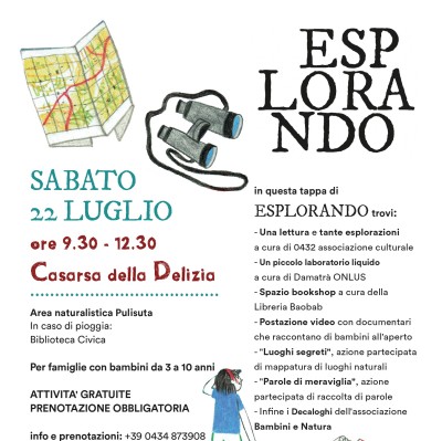 Una mattinata di divertimento nel verde per i bambini tra i 3 e 10 anni grazie a un evento della rassegna comunale Estate a Casarsa della Delizia: sabato 22 luglio, dalle 9.30 alle 12.30, nell’area naturalistica della Pulisuta, immersa nella campagna tra Casarsa e San Giovanni, è in programma “Esplorando” (in caso di maltempo Biblioteca Civica), su organizzazione di 0432 Associazione culturale in collaborazione con l’Amministrazione comunale. In programma letture, laboratori e avventure. Partecipazione gratuita con prenotazione obbligatoria (telefono 0434.873908, e-mail cultura@comune.casarsadelladelizia.pn.it).