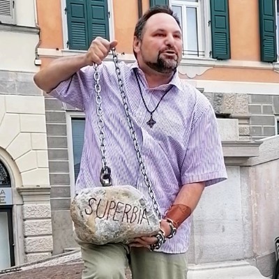 Trascinando a fatica la pietra di quasi venti chili – sulla quale ha scritto in rosso il nome di quello che per la fede cattolica è il primo dei sette vizi capitali -, lo scrittore e pensatore friulano ha sottolineato, dinanzi a decine di passanti sorpresi dal suo gesto clamoroso, la necessità di una riflessione su quanto l’orgoglio umano oggi calpesti la natura, pretendendo di riscrivere le leggi biologiche, ma anche la società, alienando il senso della comunità attraverso la tecnologia e il distanziamento sociale, non da ultimo ha accusato il governo di superbia per il fatto di «inviare armi destinate a offendere quando nel Paese ci sono milioni di poveri». Il filosofo si è richiamato a San Francesco e a un modello di vita basato sul perdono reciproco e sull’unità fra i popoli.