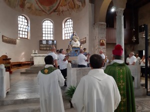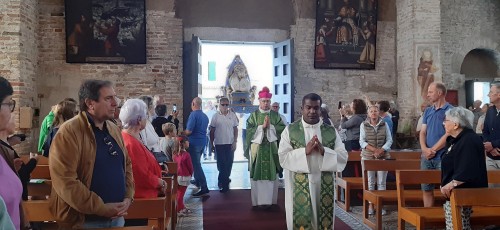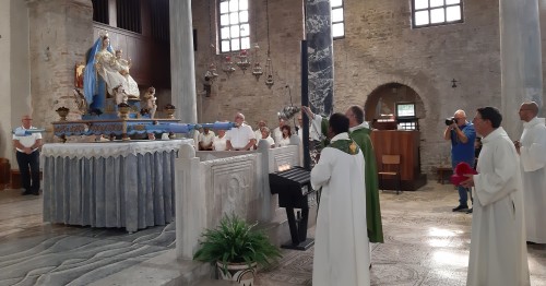 Al termine della Messa, la cantoria – che rende ancora più festose e partecipate le celebrazioni domenicali in quella che era Cattedrale al tempo dei Patriarchi – ha intonato il conosciutissimo e molto amato inno “Madonnina del Mare” che tutti cantano con tanta devozione a piena voce e che all’ultima nota salutano con il consueto fragoroso applauso.