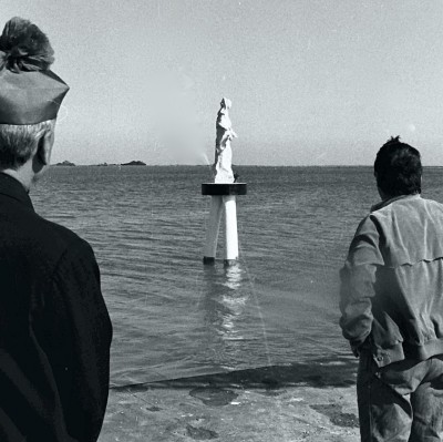 In copertina, monsignor Silvano Fain osserva la Madonnina del Mare appena finiti i lavori; all’interno, altre immagini della installazione della statua in laguna.