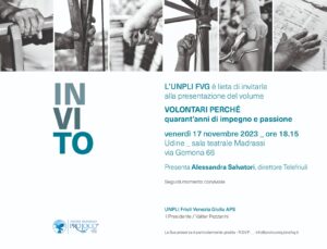 Si conclude il programma di celebrazioni per i 40 anni del Comitato regionale delle Pro Loco del Friuli Venezia Giulia. Dopo l’evento inaugurale a Gemona, svoltosi in concomitanza con i 120 anni della Pro loco cittadina, il prossimo appuntamento sarà domani, 17 novembre, alle 18.15 nella sala teatrale Madrassi, a Udine. Qui verrà presentato il volume “Volontari perché – Quarant’anni di impegno e passione”, pubblicazione che oltre a raccontare la storia del Comitato vuole anche aprire una finestra su presente e futuro del mondo delle Pro Loco. Cuore del volume le fotografie in bianco e nero che ritraggono volti e mani dei volontari delle Pro Loco regionali, unite ai resoconti delle presidenze succedutesi (Luciano Vale, Franco Molinari, Flavio Barbina e Valter Pezzarini) e ai loghi di tutte le Pro Loco regionali.