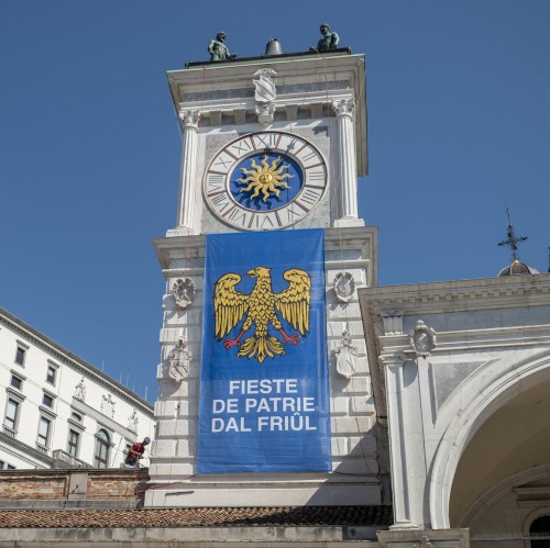 In copertina, la bandiera del Friuli storico in piazza Libertà a Udine.
