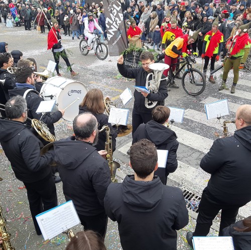 In copertina, la Banda di Vergnacco (qui alla sfilata 2023) è stata molto applaudita ieri pomeriggio sotto il tendone di Nimis.