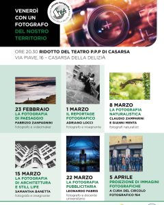 Il programma prevede la prima lezione oggi, 23 febbraio, con l’udinese Fabrizio Zanfagnini, fotografo e videomaker, per parlare di paesaggio. Si proseguirà il 1° marzo con Adriano Locci, fotografo e insegnante, per esplorare il mondo del reportage fotografico. L’8 marzo con Claudio Zamparini e Gianni Menta, fotografi naturalisti, si affronterà invece il tema della fotografia naturalistica. Il 15 marzo con Samantha Banetta, fotografa e insegnante, si parlerà di fotografia d’architettura e still life. Quindi, il 22 marzo, con Leonardo Fabris, fotografo e insegnante universitario, si tratterà il tema della fotografia pubblicitaria. A chiudere, il 5 aprile l’ultimo incontro con la proiezione di immagini fotografiche dei membri del Circolo Fotografico F64. Tutti gli incontri avranno inizio alle 20.30, al ridotto del teatro Pier Paolo Pasolini di Casarsa.