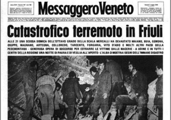 In copertina, il Duomo di Gemona simbolo di Gemona distrutta; all’interno, la prima pagina del Messaggero Veneto il giorno successivo al sisma del 6 maggio 1976.
