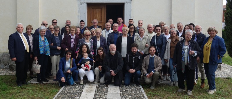 In copertina, don Rizieri durante la Messa e qui sopra il folto gruppo dei De Tina per la foto-ricordo davanti alla chiesetta.