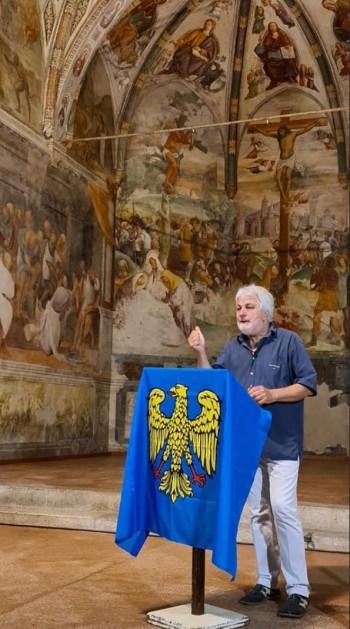 In copertina, Dino Persello durante un incontro a villa Gallici Deciani; all’interno, in uno spettacolo nell’amata “Sistina del Friuli” la Chiesa di Sant’Antonio Abate nella sua San Daniele.