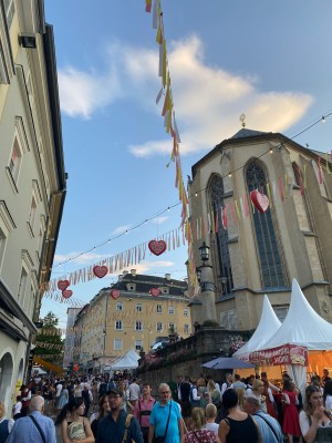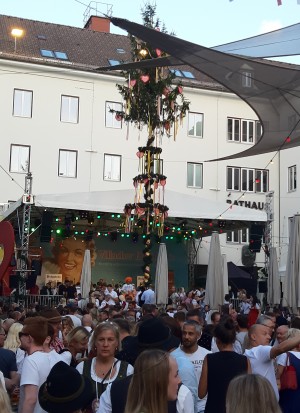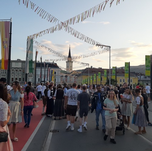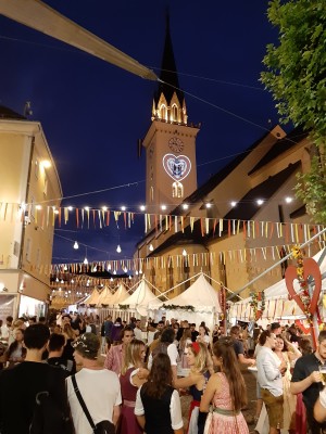 Villach – che da sempre ha un legame speciale con il Friuli, a cominciare dalla vicina Tarvisio, e con Udine in particolare – conta poco più di 60 mila abitanti ed è la seconda città della Carinzia dopo Klagenfurt, capoluogo del Land. Ma questa popolazione durante i giorni della sagra risulta praticamente quintuplicata, e forse anche più, tanta è la gente che vi arriva da ogni angolo dell’Austria e appunto dall’Italia, richiamata da un modo di fare festa molto frizzante e tradizionale tipico della gente d’Oltralpe, la quale partecipa con i bellissimi abiti tipici: Dirndl e belle camicette per ragazze e donne, Lederhosen, i pantaloni di cuoio – rigorosamente corti in questa stagione -, per giovanotti e uomini. In Austria, infatti, il costume della tradizione è il “vestito della festa” per eccellenza e tutti lo indossano con orgoglio. Per cui alla sagra c’era veramente uno sfoggio di questi abiti che superava di gran lunga quelli che noi usiamo comunemente.