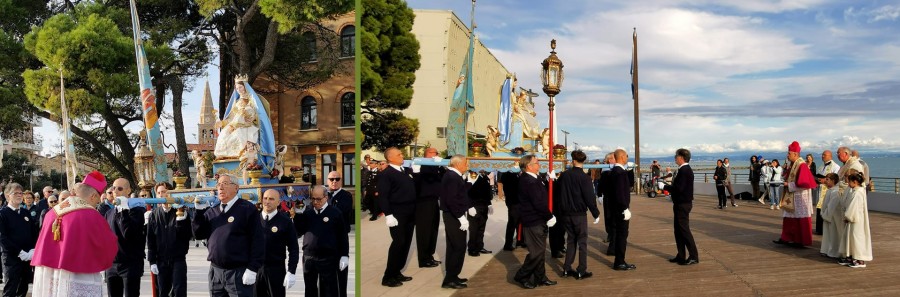 In copertina, monsignor Paolo Nutarelli riceve l’offerta dei Portatori della Madonna di Barbana; all’interno, la processione sulla diga Nazario Sauro, con la benedizione del mare, e nel centro storico di Grado.