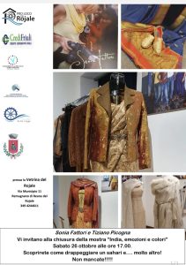 (g.l.) Ultimo giorno oggi, 26 ottobre, per visitare alla Vetrina del Rojale a Remugnano – proprio di fronte al palazzo municipale di Reana – la bellissima mostra di Sonia Fattori e Tiziano Picogna dal titolo “India, emozioni e colori”. Per la cerimonia di chiusura della esposizione, che durante la sua apertura ha suscitato notevole interesse, l’appuntamento è alle 17. “Scoprirete come drappeggiare un sahari e… molto altro”, annunciano gli artisti per cui invitano a non mancare e a immergersi, proprio in quest’ultima occasione, tra le coloratissime suggestioni del lontano Paese asiatico. La manifestazione artistica – nel solco di quella che è diventata una importante tradizione nel Comune di Reana proprio alla Vetrina di Remugnano – è stata organizzata dalla Pro Loco del Rojale con il patrocinio della civica amministrazione. Per ulteriori informazioni 349.4244611.