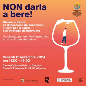 Appuntamento oggi, dalle 17 alle 19, al Centro culturale di Palazzo Gregoris, sede della Storica Società Operaia di Pordenone, per parlare del fenomeno dell’alcolismo tra i giovani, dandone una panoramica della portata, e insieme dei rischi e delle strategie di intervento, nel convegno dal titolo “Non darla a bere”, organizzato grazie al sostegno della Regione Friuli Venezia Giulia e in sinergia con l’assessorato alle Politiche sociali del Comune di Pordenone, con il quale la Somsi sta proseguendo con vivo interesse un progetto intorno alle “dipendenze giovanili”, avendo già toccato ambiti come quello del fenomeno “Hikikomori” e del tabagismo.