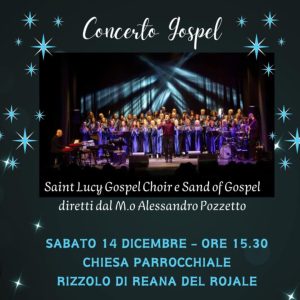 (g.l.) Clima natalizio alle stelle oggi a Rizzolo con il “Concerto Gospel” che si terrà alle 15.30, nella Chiesa parrocchiale della frazione di Reana del Rojale. Protagonisti della manifestazione musicale, con ingresso libero, il “Saint Lucy Gospel Choir” e il “Sand of Gospel” diretti dal maestro Alessandro Pozzetto.