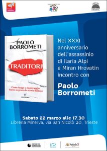 Infine, sabato 22 marzo, alle ore 17.30, alla libreria Minerva di Trieste, in via San Nicolò, incontro con Paolo Borrometi, giornalista da anni sotto scorta per le sue inchieste sulla mafia, presidente di Articolo 21, condirettore dell’Agenzia Agi, autore di “Traditori. Come fango e depistaggio hanno segnato la storia italiana”. Un libro sulla storia oscura del nostro Paese e sul dovere di raccontare per sapere da che parte stare, ma anche un omaggio ai tanti operatori della nostra Repubblica – cittadini, amministratori, giornalisti, sacerdoti – morti loro malgrado facendo il proprio dovere.