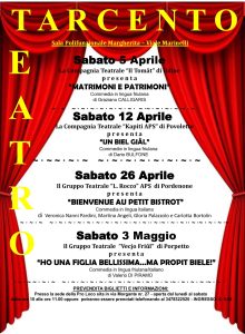 (g.l.) Tarcento ritorna a teatro. Oggi, infatti, nella sala polifunzionale Margherita di viale Marinelli, prenderà il via una rassegna in quattro puntate che si concluderà il 3 maggio prossimo, dopo aver presentato spettacoli anche il 12 e il 26 aprile. Questa sera, a inaugurare il cartellone sarà la Compagnia teatrale “Il Tomât” di Udine che porterà in scena la commedia in lingua friulana di Graziano Calligaris “Matrimoni e patrimoni”. Anche nelle tre successive serate saranno presentate delle commedie con protagonisti gruppi teatrali provenienti, nell’ordine, da Povoletto, Pordenone e Porpetto. L’ingresso a ogni spettacolo costa 5 euro.
