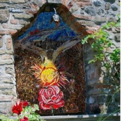 Suggestiva la descrizione che fa dell’opera di Gianni e Matelda il giornalista Nicola Cossar, amico degli artisti da lunga data: «Un disco d’oro a rappresentare il calice che celebra il sacrificio del Cristo per noi. Una rosa rossa racconta invece il sangue dello stesso sacrificio, ma anche il senso della resurrezione e della vita stessa, assieme al celeste del cielo che scende dall’alto come benedizione, memoria e speranza». E attingendo, ancora, alle parole di Cossar: «Le edicole votive sono piccole cappelle religiose, proteggono il luogo sul quale sono edificate. Tramandate da secoli nella cultura popolare che le considera come “casa del Signore” in un contesto tra il sacro e il profano ad assistere spiritualmente le persone che vi passano». Così, anche Ribis ritrova un suo simbolo che Gianni e Matelda Borta oggi donano alla comunità del Rojale.