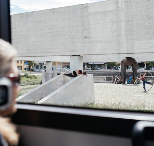 COS’È – Si tratta di una performance multidisciplinare, un tragitto letterario, inatteso, gremito di suggestioni visive e sonore, di acrobazie, di storie. Tutto accade contemporaneamente, dentro e fuori l’autobus, dove quel che accade nel reale diventa istantaneamente trama del racconto. Tiene insieme molteplici linguaggi e discipline artistiche: in cuffia si ascoltano parole musiche, suoni composti ad hoc, ma anche interviste fatte agli autisti degli autobus. Durante il tragitto, fuori dall’autobus, accadono piccole performance che rendono il viaggio magico e surreale, arrivando verso la fine a disorientare il pubblico che fatica a riconoscere se ciò che vede è reale o è stato pianificato.