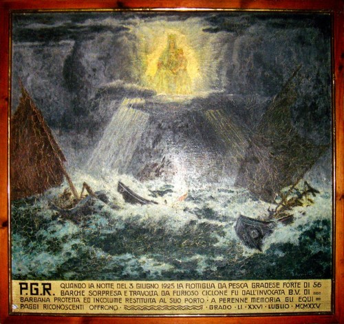 I pescatori sono l’anima ed il cuore delle più antiche e radicate tradizioni di Grado: il forte carattere di indipendenza e la libertà che li caratterizza, e ancor di più il forte senso religioso che li anima, sono le testimonianze vive del passato isolano. Attraverso queste testimonianze, domani si andrà pertanto a scoprire l’isola di Barbana che, oggi, sempre più si va identificando come un luogo dove il “visitatore” decide di trovare spazio per le proprie meditazioni e riflessioni. Particolare attenzione verrà data, appunto, alla visita degli ex voto conservati all’interno del Santuario, che raccontano ancora oggi uno spaccato particolare della società locale. Tra questi, l’ex voto dipinto dall’artista viennese Josef Maria Auchentaller, nel 1925, a ricordo del salvataggio in mare, durante una tremenda tempesta, di 315 pescatori e 56 barche avvenuto lo stesso anno: l’Isola di Grado aveva pregato intensamente l’intercessione della Madonna di Barbana.