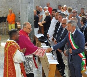 (g.l.) In questi anni, una preziosa presenza estiva per la Parrocchia di Grado è stata quella di don Anton Gavasker, sacerdote che entro l’anno tornerà nel suo Sri Lanka (l’ex Ceylon), nel continente asiatico, ma il suo ricordo resterà sempre vivo e colmo di gratitudine nell’Isola del Sole. «Qui – gli è stato detto durante la Messa solenne per i Santi Ermagora e Fortunato che lui stesso ha presieduto nella Basilica di Sant’Eufemia – sarai sempre di casa», tanto è l’affetto che l’ha circondato durante la sua apprezzata pastorale quale prezioso aiuto all’arciprete Paolo Nutarelli. E, a ricordo di Grado, gli sono stati fatti dei doni che ha molto gradito. Nel contempo, il grazie a don Anton ha voluto esprimere riconoscenza anche per aver “custodito” in piazza San Pietro, nella Città del Vaticano, il grande Presepe lagunare che Grado ha donato al compianto Papa Francesco in occasione dell’Anno Santo. Il rito è stato reso ancora più solenne e partecipato dai canti eseguiti dalla Corale orchestra “Santa Cecilia” diretta da Anello Boemo.
