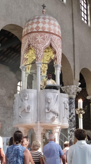 In una gremita Basilica patriarcale, Grado ha pertanto celebrato con grande solennità la Festa dell’Assunzione di Maria. La Messa, presieduta dall’arciprete monsignor Paolo Nutarelli, è stata accompagnata dalla Corale “Santa Cecilia”, che, con la direzione di Anello Boemo, ha eseguito la “Messa di Sant’Antonio” di Luigi Ricci, impreziosendo la liturgia con intensità e armonia. Le letture sono state proclamate in tedesco, italiano e inglese, mentre l’ordinario della Messa è stato cantato, come detto, in latino, «segno di una Chiesa che parla a tutti i popoli», come ha osservato l’arciprete. Sull’antico pulpito patriarcale per la proclamazione del Vangelo è salito don Anton Gavasker che da anni offre un prezioso aiuto in Parrocchia durante ogni estate e che tra non molto tornerà nel suo Sri Lanka, nel continente asiatico. Come si ricorderà, il sacerdote era stato festeggiato un mese fa in occasione della ricorrenza dei Santi Patroni Ermagora e Fortunato.