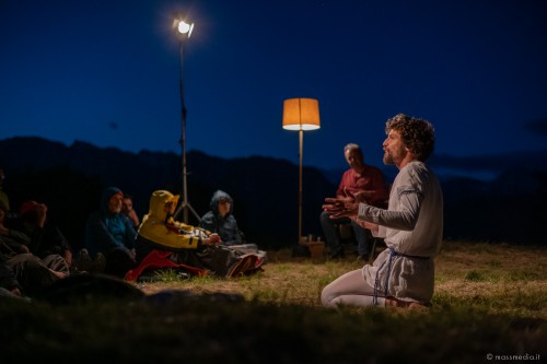 La pièce prende spunto dall’incontro degli attori Mattia Cason e Alessandro Conte – entrambi diplomati alla Civica Accademia d’Arte Drammatica Nico Pepe – con Muhammad‘Abd al-Mun’im, editore, scrittore e poeta di Aleppo costretto ad abbandonare la Siria per le sue opinioni avverse al regime di Bashar al-Assad e ora rifugiato in Slovenia. Nel romanzo Ala Durūbi Awrūba (Sui sentieri per l’Europa), da cui lo spettacolo prende il nome, ha raccontato il suo drammatico viaggio fino a Lubiana, attraverso la Turchia, l’Egeo e i Balcani. Il suo testo si intreccia e si fonde sulla scena con quello di un anonimo scrittore siriano del XV secolo, “La biografia di Alessandro” e ciò che in essa vi è di strano e meraviglioso, che narra le avventure, in parte storiche ma per lo più fantastiche, di Alessandro Magno, ne descrive la brama di conquista, ma anche la curiosità per l’alterità. Attraverso i linguaggi del teatro, della danza e del cinema, lo spettacolo sovrappone piani temporali diversi – l’eterno presente del mito, la storia antica, le vicende del secolo scorso e quelle contemporanee dei protagonisti – per ricordare agli spettatori la centralità delle migrazioni nella costruzione della storia europea, invitandoli ad aprirsi a loro volta alla curiosità e alla meraviglia: il primo, necessario passo per considerare le migrazioni di oggi quale chiave per costruire un’Europa più unita, più afroasiatica, più Europa, superando i concetti di Nazione e di Occidente.