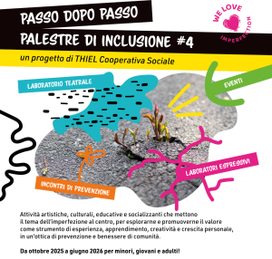 “Passo dopo passo. Palestre di inclusione #4”, il progetto ideato dalla cooperativa sociale Thiel, prosegue e amplia il percorso avviato nelle precedenti tre edizioni coinvolgendo centinaia di persone, consolidando un modello che unisce inclusione sociale, benessere e partecipazione comunitaria. La proposta si sviluppa attraverso attività artistiche, culturali, educative e socializzanti gratuite, coinvolgendo minori, giovani e adulti in un’ottica di prevenzione e salute di comunità. Il filo conduttore della IV edizione sarà il tema dell’imperfezione – vissuto con ansia e paura da giovani e adulti – per promuoverne il valore di esperienza, crescita e sviluppo.