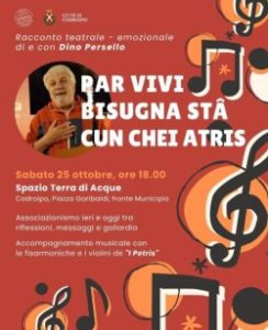 Il racconto teatrale-emozionale di e con Dino Persello si terrà alle 18 (come sempre con ingresso libero) nello Spazio Terra di Acque, nella centralissima piazza Garibaldi, di fronte al palazzo municipale. E cosa porterà in scena il “nostro”? Ma naturalmente l’associazionismo di ieri e oggi – tema che gli è molto caro – tra riflessioni, messaggi e goliardia. Anche perché lui è fermamente convinto che “par vivi bisugna sta cun chi atris” (tradotto: per vivere bene bisogna saper stare anche con gli altri). E come dargli torto?