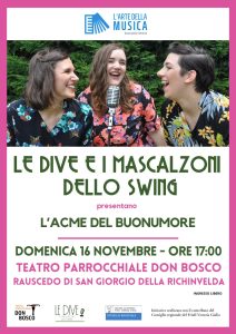 Le Dive e i Mascalzoni dello Swing, formazione di eccellenza nata nel 2018 e composta da alcuni tra i migliori musicisti friulani, recupererà i classici swing italiani degli anni ’30, ’40 e ’50, rendendo inoltre omaggio al talento del triestino Lelio Luttazzi, pianista, conduttore televisivo e autore che contribuì in modo fondamentale alla diffusione dello swing in Italia. Il gruppo si esibirà con una ricca strumentazione: tre voci femminili, supportate da fisarmonica, clarinetto, chitarra, contrabbasso e batteria, per un’ora e mezza di musica e narrazione senza interruzioni. «Lo spettacolo è aperto a tutti – ha concluso Milan -: un’occasione imperdibile per gli estimatori dello swing e per chiunque voglia esplorare in modo nuovo e coinvolgente le radici culturali friulane».