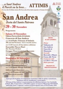Il concerto di questa sera sarà preceduto, alle 20, nella stessa parrocchiale, da una commemorazione di Padre Tristano d’Attimis a 300 anni dal noviziato. Domani mattina, invece, alle 10.30 ci sarà un suggestivo concerto di campane in attesa della Messa solenne delle 11. Quindi, la “due giorni” di festa sarà coronata alle 12.30, nell’edificio delle scuole elementari, dal Pranzo di Sant’Andrea, il cui menù è molto invitante; seguiranno divertenti giochi popolari.