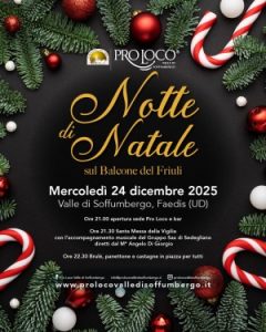 Il fascino del Natale torna a risplendere su Valle di Soffumbergo, il suggestivo borgo montano del Comune di Faedis. Anche quest’anno, infatti, la Pro Loco rinnova l’appuntamento con la tradizionale “Notte di Natale sul Balcone del Friuli”, una serata che unisce spiritualità, calore comunitario e sapori autentici del territorio. Il programma della Vigilia di Natale, mercoledì 24 dicembre, prenderà il via alle 21 con l’apertura della sede della Pro Loco e del bar. Alle 21.30 seguirà la Messa della Vigilia, resa ancora più suggestiva dall’accompagnamento musicale del Gruppo Sax di Sedegliano, diretto dal maestro Angelo Di Giorgio.