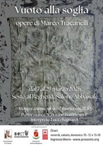 A Sesto al Reghena, uno dei Borghi più belli d’Italia, sarà inaugurata sabato 7 marzo, alle 17.30, “Vuoto alla soglia”, personale di Marco Tracanelli patrocinata dal Comune, dalla Pro Loco e dall’Associazione Culturale Sexto. L’esposizione sarà visitabile con ingresso libero nel salone abbaziale, in Piazza Castello, fino al 29 marzo dal venerdì alla domenica, dalle 10 alle 13 e dalle 15 alle 18. La vernice ospiterà anche la performance “Contano i centimetri” interpretata da Lucia Bagnarol.