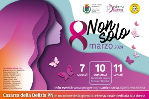 Domenica 10 marzo invece ecco la “Camminata in rosa” alle 14.30 con partenza e arrivo dal Giardino del Progetto Giovani a Casarsa. Si tratta di una camminata di circa 5 km aperta a tutti, organizzata in occasione della Giornata Internazionale dei diritti della donna per una sensibilizzazione sui temi delle pari opportunità. La camminata si svolgerà rispettando le norme del codice della strada. Partecipazione libera. Per chi lo vorrà, si può partecipare indossando un capo di abbigliamento rosa.